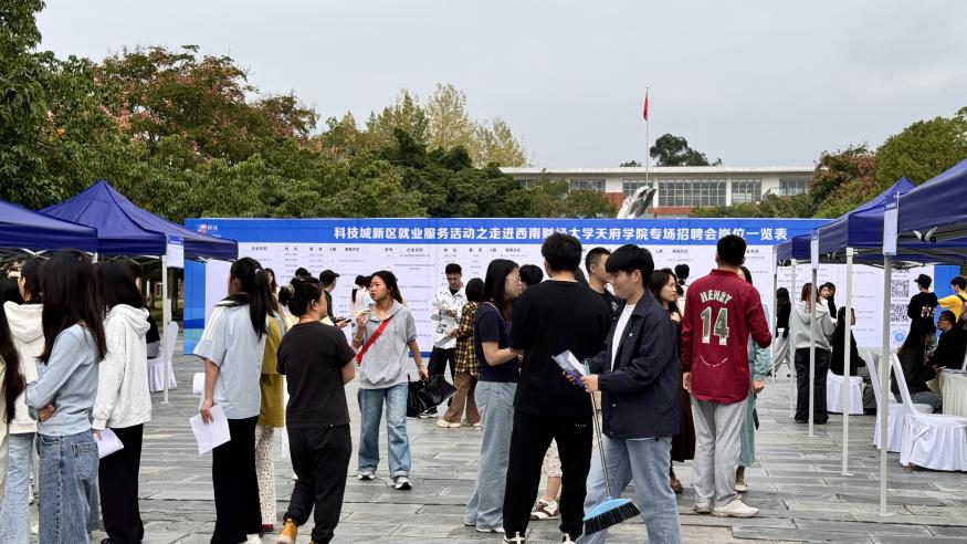 正值“金九银十”毕业生求职关键期,为深入贯彻落实党中央、国务院和教育部决策部署,抢抓秋招关键期,发挥校园招聘主渠道作用,助力2026届毕业生更加充分高质量就业,10月16日,由绵阳市人力资源和社会保障局、绵阳市就业创业促进中心主办,西南财经大学天府学院就业指导中心与绵阳科技城新区管委会联合举办的“就在新区·创享未来”科技城新区就业服务活动之走进西南财经大学天府学院专场招聘会在天府学院绵阳校区光华广场顺利举办。
